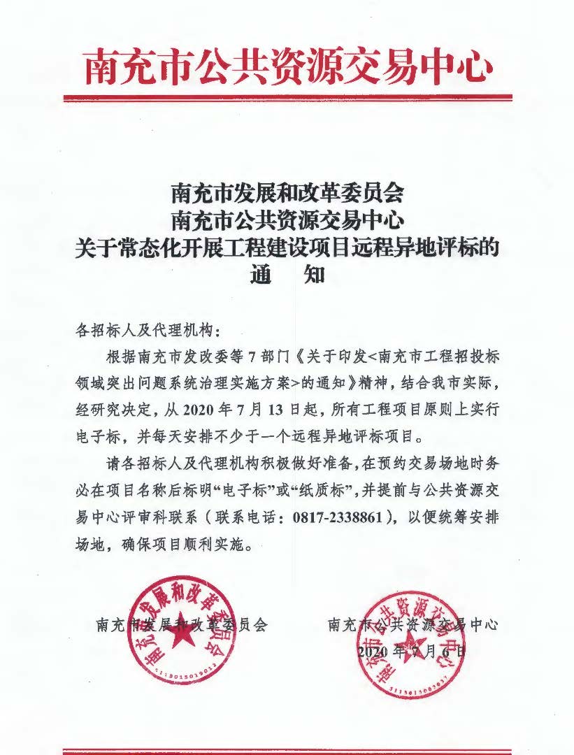 南充市發(fā)展和改革委員會(huì)、南充市公共資源交易中心關(guān)于常態(tài)化開(kāi)展工程建設(shè)項(xiàng)目遠(yuǎn)程異地評(píng)標(biāo)的通知