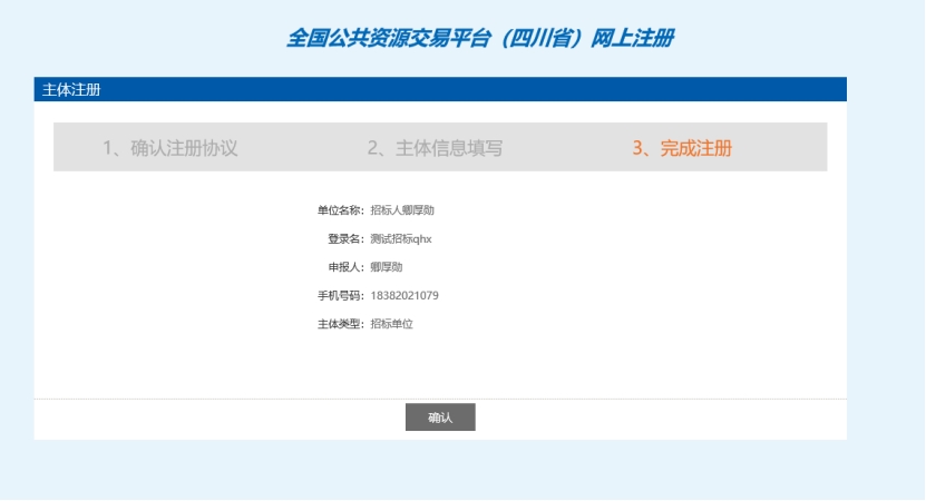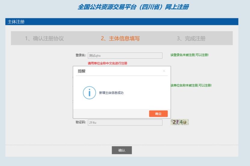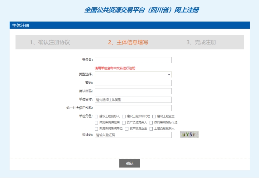 輸入登錄名、密碼等基本信息,如果該登錄名已被注冊(cè)過,必須更換登錄名。如果單位已經(jīng)注冊(cè)過,則不需要重復(fù)注冊(cè)。選擇“主體類型”及“單位角色”(角色可以根據(jù)自己?jiǎn)挝磺闆r多項(xiàng)選擇),輸入驗(yàn)證碼之后,點(diǎn)擊“確認(rèn)”按鈕。