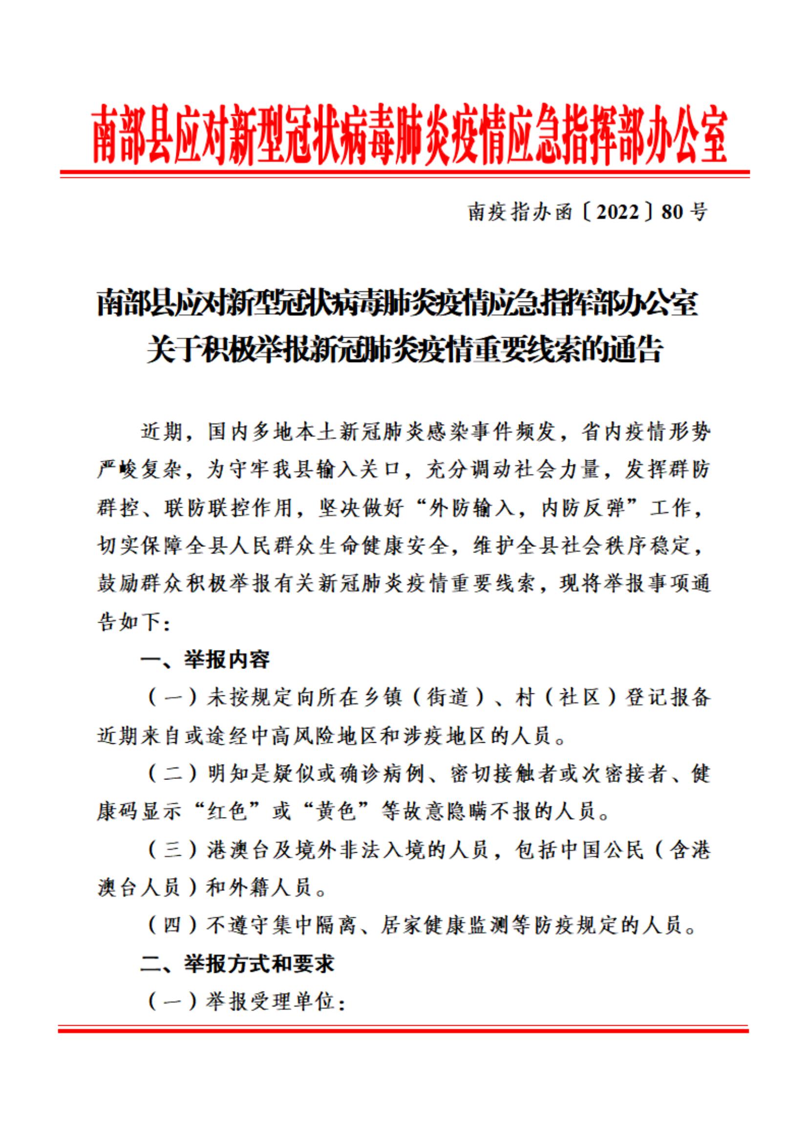 南部縣關(guān)于積極舉報新冠肺炎疫情重要線索的通告