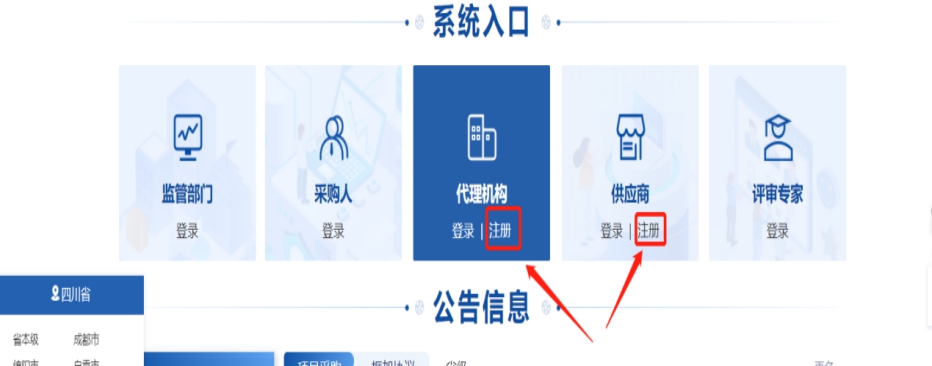 系統(tǒng)用戶打開門戶網(wǎng)站,通過門戶網(wǎng)站的系統(tǒng)入進(jìn)行登錄系統(tǒng),其中代理機(jī)構(gòu),供應(yīng)商可以進(jìn)行注冊,評審專家可指定時間進(jìn)行注冊。如下圖所示:
