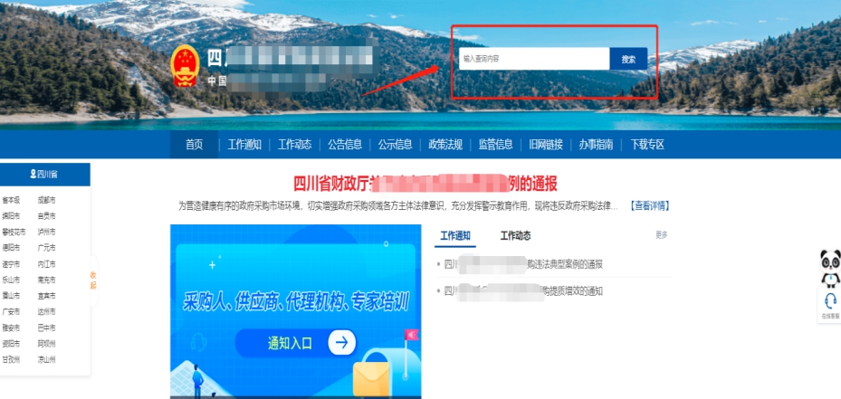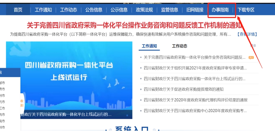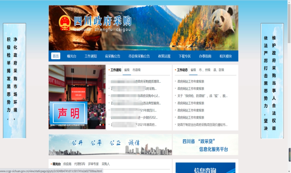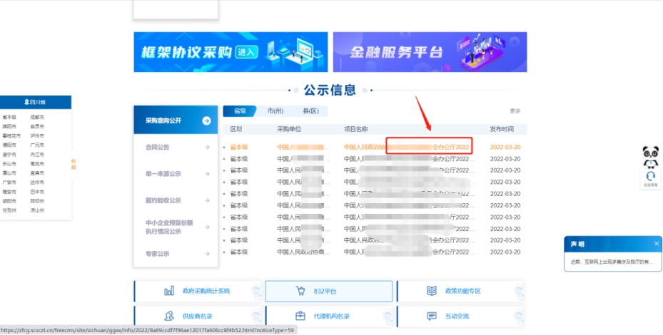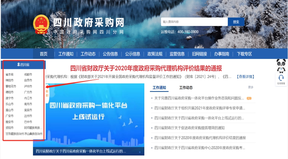 在首頁左邊的彈框中可以點(diǎn)擊四川省各個地州直接查看各個地州的公告信息,如下圖所示: