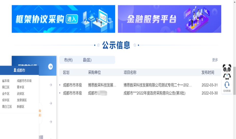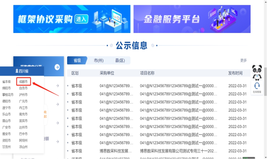 該功能是用戶進(jìn)入四川政府采購網(wǎng),點(diǎn)擊對應(yīng)市州或區(qū)縣后,整個門戶網(wǎng)頁信息將顯示對應(yīng)市州或區(qū)縣相關(guān)工作動態(tài)和公告信息。