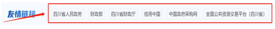 在門戶主頁最下方的友情鏈接欄目是與政府采購有關(guān)聯(lián)的其他部門網(wǎng)站鏈接以及交易平臺等,如圖所示,例如:四川省人民政府、財(cái)政部、四川省財(cái)政廳、中國政府采購網(wǎng)和全國公共資源交易平臺(四川)等,點(diǎn)擊對應(yīng)的鏈接,即可打開相應(yīng)的網(wǎng)址鏈接。如下圖所示: