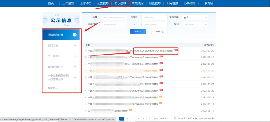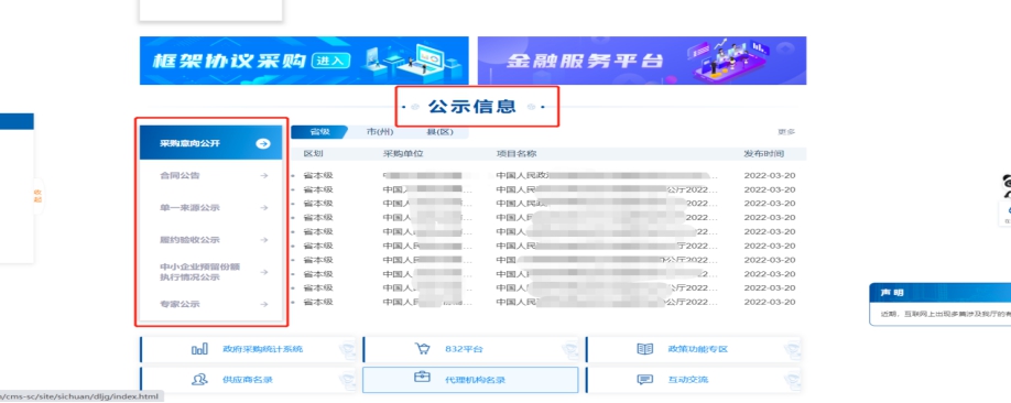 包括:采購意向公開、合同公告、單一來源公示、履約驗(yàn)收公示和中小企業(yè)預(yù)留份額執(zhí)行情況公示和專家公示對應(yīng)的可以選擇所屬區(qū)劃:省級、市級和縣(區(qū))。如下圖所示: