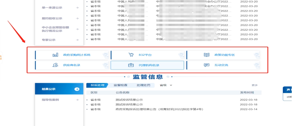 在信息公示欄的最下方具有六個快捷鏈接入口,分別是:政府采購統(tǒng)計(jì)系統(tǒng)、832平臺、政策功能專區(qū)、供應(yīng)商名錄、代理機(jī)構(gòu)名錄和互動交流。點(diǎn)擊圖片或文字鏈接即可直接進(jìn)入對應(yīng)的網(wǎng)址。如下圖所示: