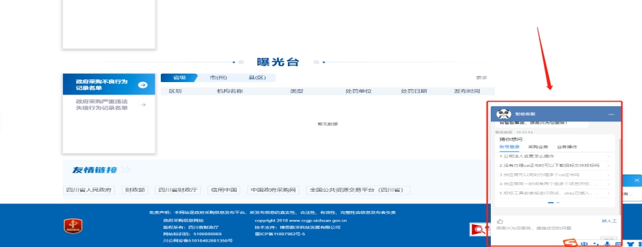 政府采購網(wǎng)的在線智能客服鎖定位置在門戶頁面中間位置的正右方,如圖所示點(diǎn)擊熊貓頭像或者“在線客服”字樣都可以打開與智能客服的對話框。如下圖所示:
