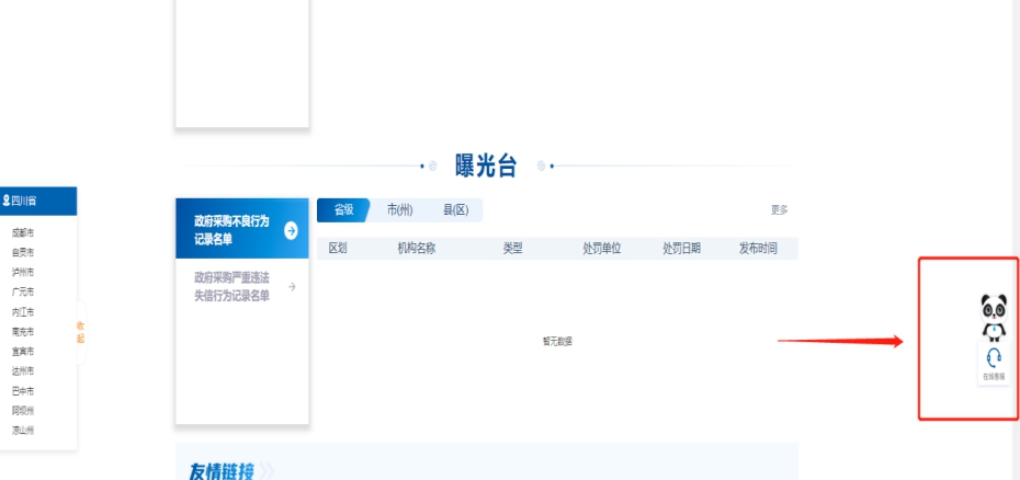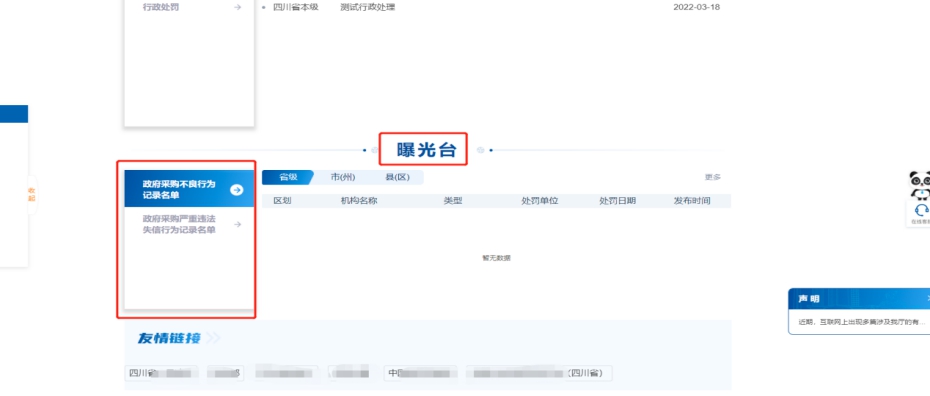 曝光臺分為省級/市級/縣(區(qū))三個區(qū)劃等級對:政府采購不良行為記錄名單和政府采購嚴(yán)重違法失信行為記錄名單進(jìn)行公告曝光。如下圖所示: