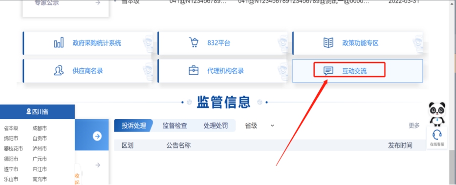 步驟一:瀏覽器打開四川政府采購網(wǎng),進(jìn)入【首頁】-【公示信息】 -【互動交流】。詳見下圖: