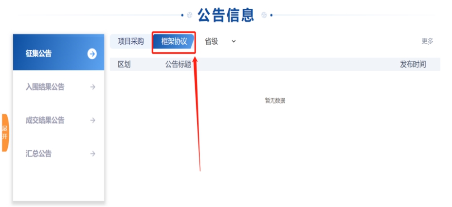 框架協(xié)議公告欄包括:征集公告、入圍結(jié)果公告、成交結(jié)果公告和匯總公告,點(diǎn)擊對應(yīng)的公告內(nèi)容進(jìn)入查看詳細(xì)公告信息。如下圖所示: