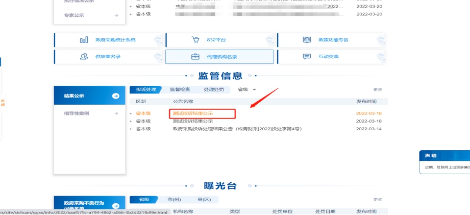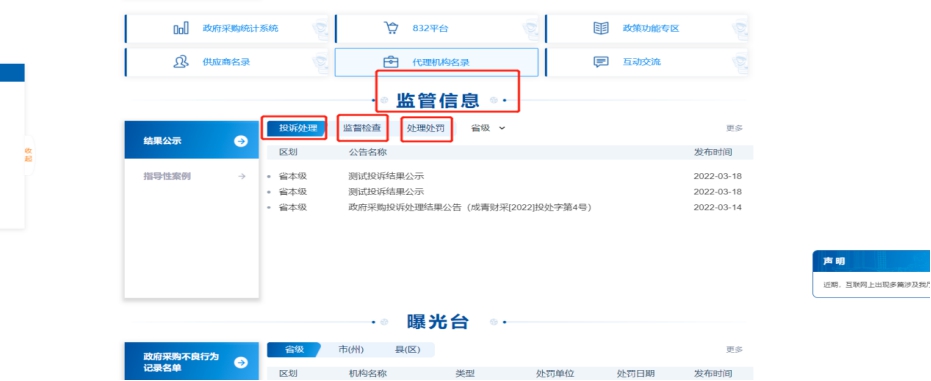 展示監(jiān)管部門處理的質(zhì)疑投訴、監(jiān)督檢查和處罰等信息,點(diǎn)擊對應(yīng)的模塊查看對應(yīng)的詳細(xì)信息,如下圖所示: